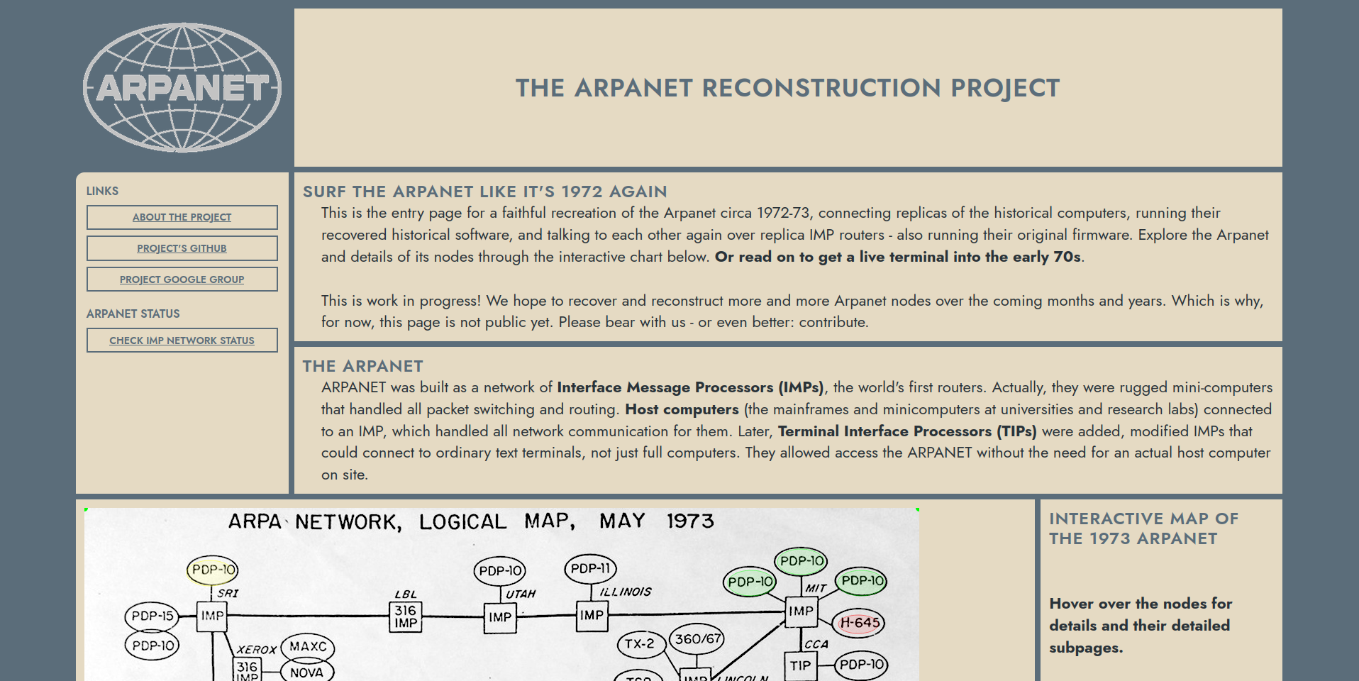 - Arpanet research: See the buttons on the interactive Arpanet map. To drag these historical nodes out of abstract obscurity, we added dedicated subpages for each of them. But they're mostly empty for now. Arpa archaeologists could adopt a node and to dig deep for more information on each of them. There is a lot to tell. The stories of these nodes, the human-interest aspects. The longer we wait with this, the less people will still be around!