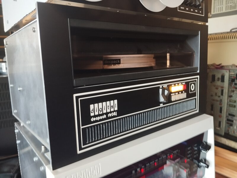 So - imagine the PiDP-11 and RK-05j below are mounted in a replica rack, with (not shown, planned) an added RK05f fixed-disk unit, a half-height blank panel and a RK11-C blinkenlight panel. Topped with a replica Digital PDP-11 masthead panel. That is the "PiDP-11 Rack Extension that we plan to make as a kit.