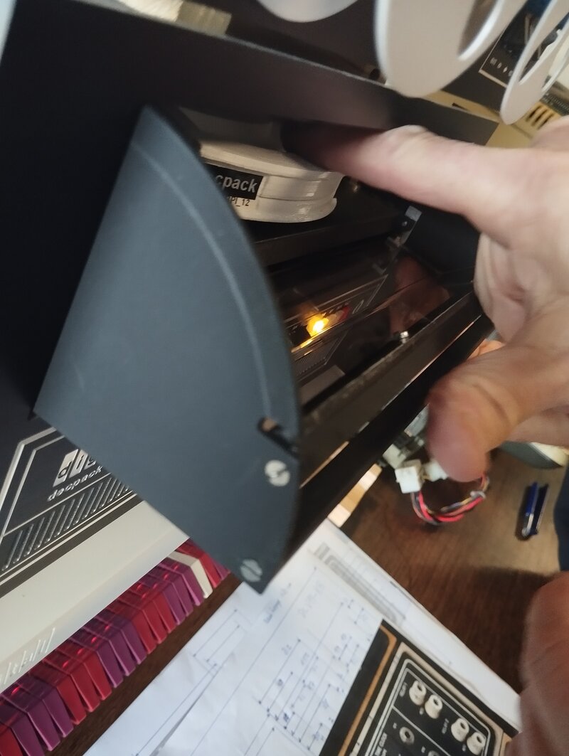 Time for a hidden disclaimer: built into the disk pack is a USB stick, which connects through a magnetic USB connector to its counterpart in the RK05 drive mechanism. So you are, indeed, looking at a glorified USB stick. We think this is perfectly acceptable - much better, in fact, than crash-prone heads etc. A magnetic USB connector on the disk pack finds its way into the drive mechanism just as smoothly (smoother, actually) than was the case in the real machine.